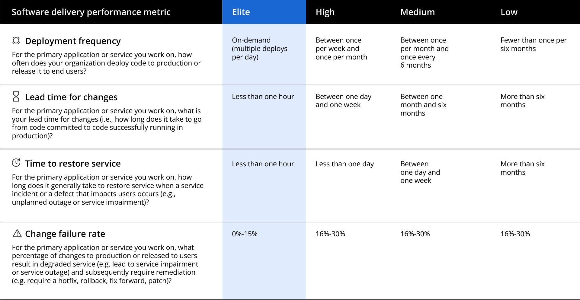 The Google Cloud Platform & DevOps Research and Assessment (DORA) study for 2021 highlights the difference between companies at various stages of DevOps adoption and outlines the direct correlation between excellence in software delivery and increased performance in a company’s technology modernizations. The Google Study classified teams as elite, high, medium or low performers based on 4 key software delivery performance metrics ( Deployment Frequency, Lead Time for Changes, Change Failure Rate, and Time to Restore Service). Similarly to previous years’ study findings, elite teams kept evolving in terms of software delivery pace. Thus the lead time for changes, i.e. the amount of time it takes a commit to get into production, was reduced from a maximum of 1 day to a maximum of 1-hour timeframe for such teams. Moreover, compared with low performers, elite performers have 6570x faster time-to-recover from incidents when failure does happen. These findings are another standing illustration of the vivid fact – companies with a high level of velocity and stability driven by thoroughly implemented DevOps practices are increasingly successful in terms of business performance and efficiency. More interesting findings of the research are depicted in the picture below:
