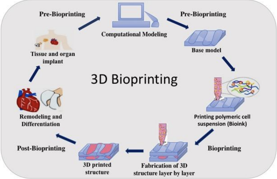 Bioprinting is essentially the process of using 3D printing techniques to construct biological tissues and potentially whole organs. In the process of bioprinting, the desired organ’s 3D anatomical structure is first mapped out using medical imaging techniques like CT or MRI scans. Then, living cells are isolated from patient tissues or stem cells and cultivated into bioinks. These bioinks are then printed layer by layer, following the anatomical blueprint, and are often placed in a bioreactor to mature before they can be used for their intended purpose.