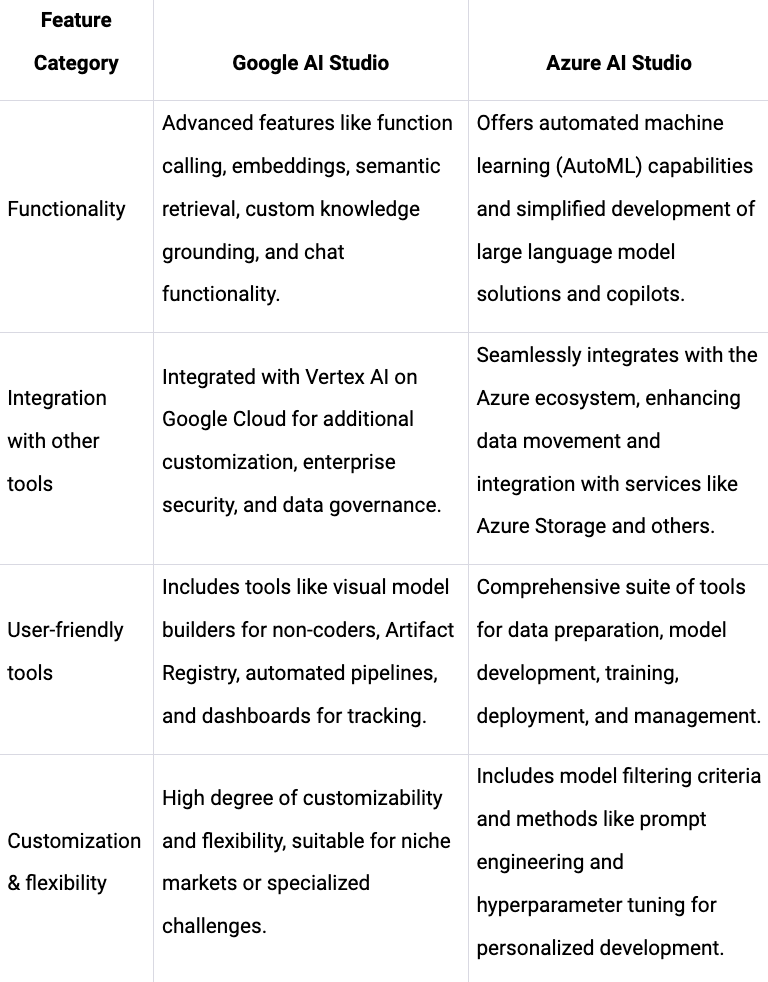The table below provides a snapshot of the core features and distinctions between Google AI Studio and Azure AI Studio, highlighting their strengths and potential areas of consideration. Each platform offers unique benefits tailored to different needs in the AI and machine learning landscape.