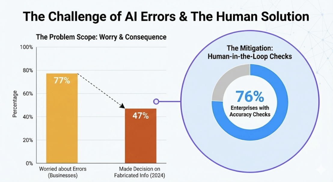 AI hallucinations happen when a model creates false information but presents it as fact. This happens because these systems don't possess actual knowledge or real world contextual understanding. Instead, they operate by predicting which word should follow another based on patterns they found in their training data. If a model faces a question it wasn't trained for or deals with a confusing situation, it might produce an answer that sounds reasonable but is totally wrong. The intention isn't to deceive anyone. The AI is just filling in the blanks with text that seems statistically probable. This remains a massive hurdle for companies trying to use the technology. The Fullview report mentioned earlier notes that 77% of businesses are worried about these errors. On top of that, 47% of people using AI for work admitted that they made at least one major business decision based on fabricated information in 2024. To combat this, 76% of enterprises have added human-in-the-loop checks to ensure accuracy before errors cause problems. This approach goes beyond simple caution. It is a fundamental part of how companies manage the risks associated with automation.