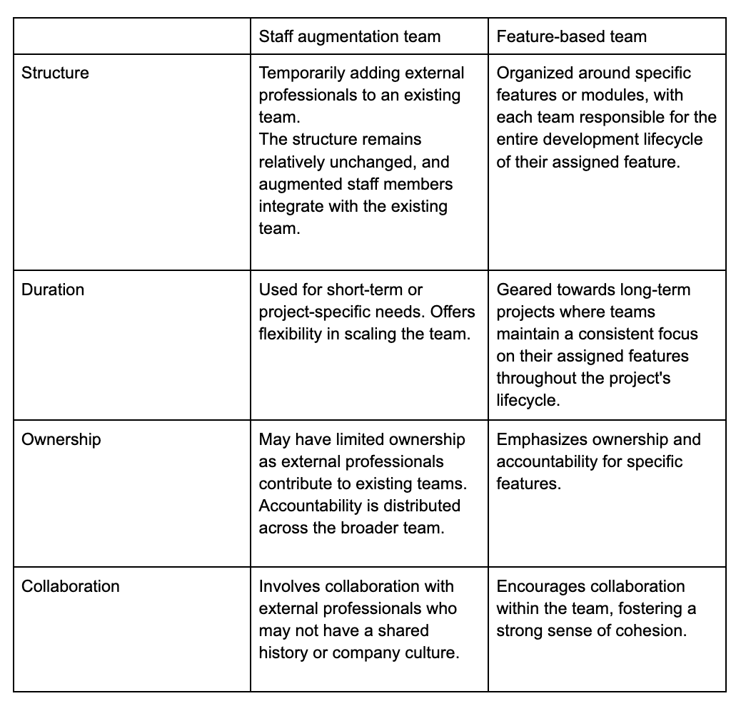 The choice between staff augmentation and feature-based teams stem from factors such as project duration, scalability requirements, and the level of specialization needed for specific features. Depending on the organizational structure, you may opt for a hybrid approach or choose the model that aligns best with your project goals.What are staff augmentation teams?