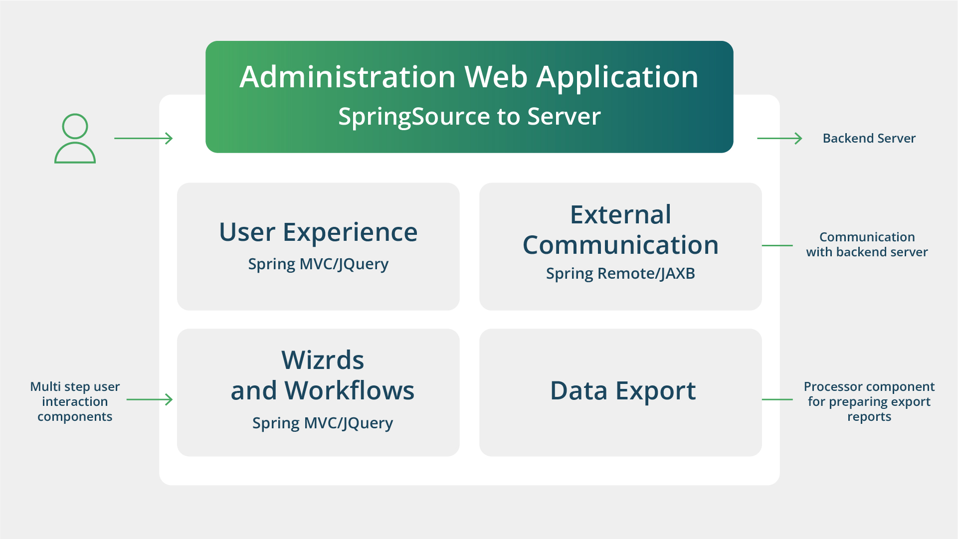 Diagram of an NEXAGE administration web application architecture showing four components: User Experience, External Communication, Wizards and Workflows, and Data Export, all connected to a backend server.[/caption]