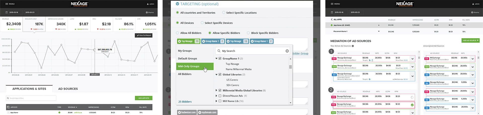 Administration Application provides all the parameters to Nexage Engine required make trading between Sellers and Buyers frictionless and efficient by creating a liquid and efficient market. Nexage, utilizing the Administration Application, provides the tools and capabilities for the developers and publishers to get to revenue quicker, while at the same time enabling very fine granularity of criteria to the Buyers to target their ads to a particular audience, specifying geography, target platform, content audience, etc.