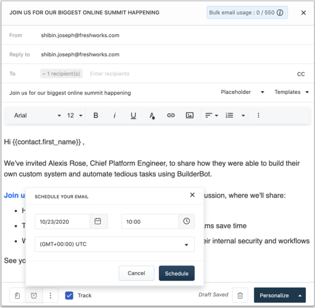 An email automation module can come with such features as email templates, scheduling, reminders, email drip campaigns, list segmentation, mass emailing, A/B testing, email analytics and more to enable effective email communication.